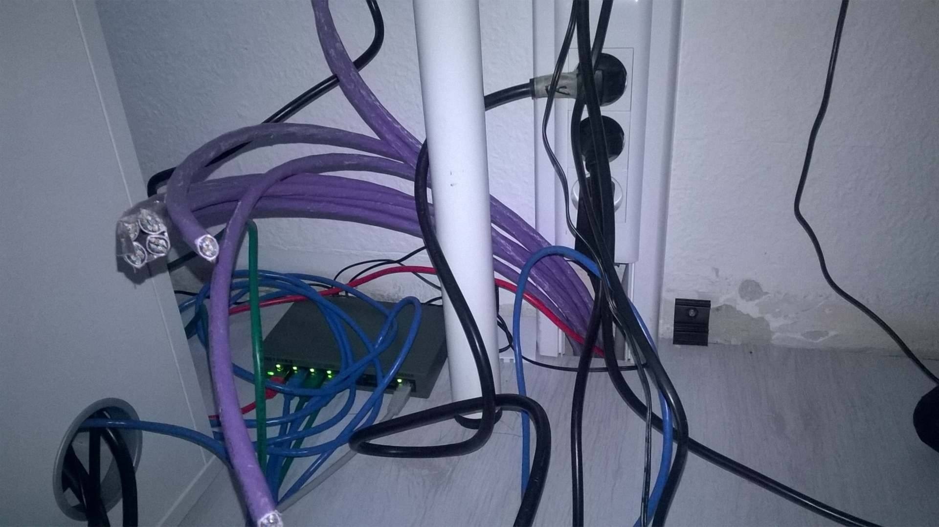(zo ziet het er op dit moment bij de bureau nog uit, met een bypass van de rode utp kabel om toch al internet te hebben)