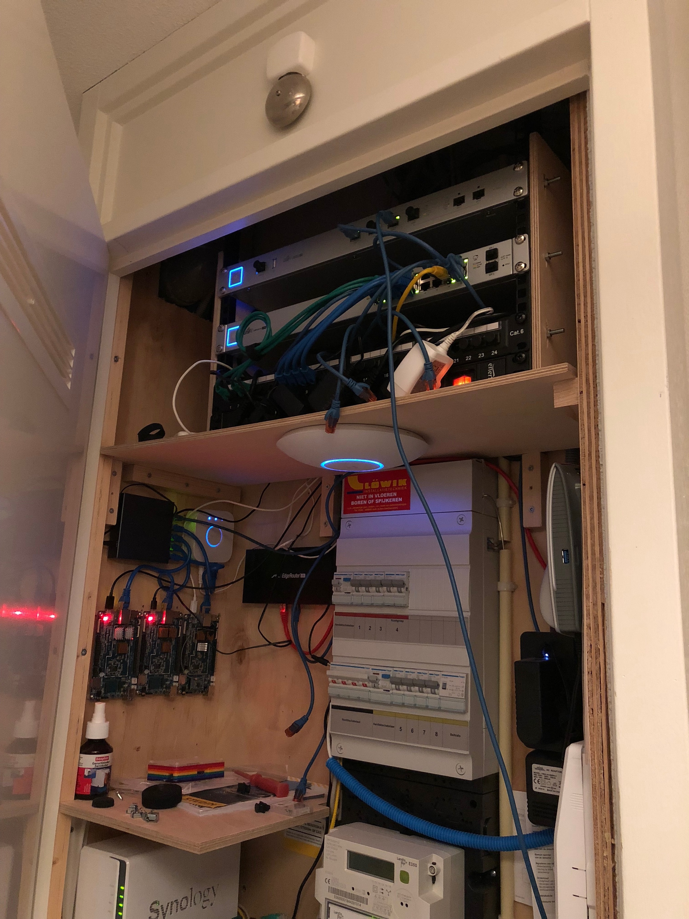 Ik zie in dit topic veel mensen die hun meterkast helemaal dicht bouwen. Ik heb altijd geleerd dat de meterkast toegankelijk moet blijven voor aanpassingen aan je technische installatie. Zelf heb ik de router aan de linkermuur hangen, en verder alles zoveel mogelijk leeg/vrij. De switch en NAS/Homeserver staat op zolder.