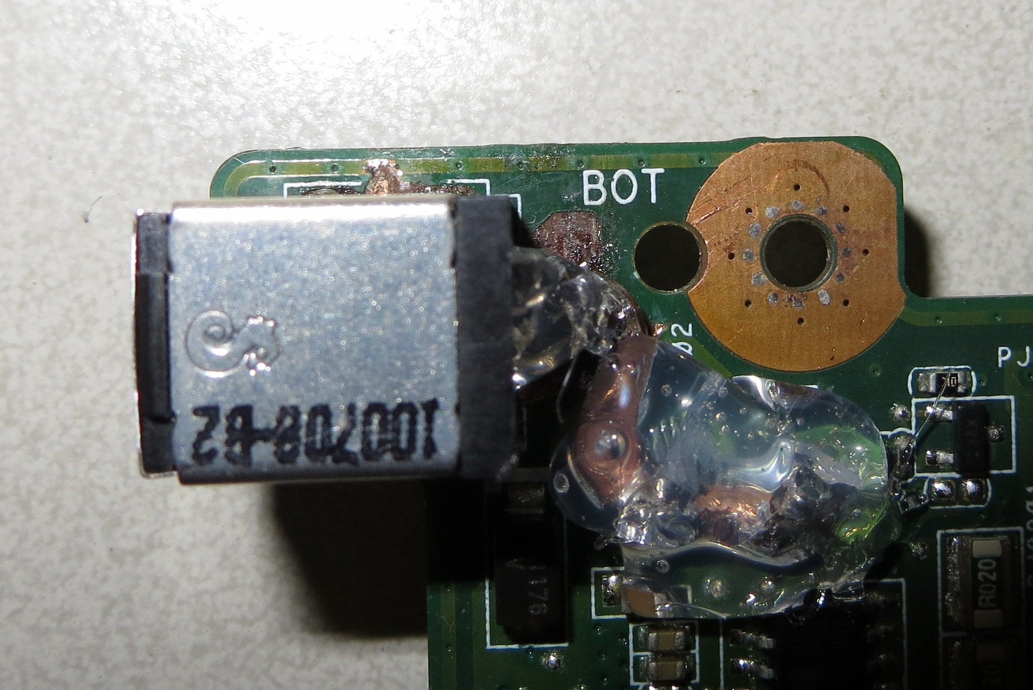 Ik heb hier een laptop moederbord liggen waarvan de DC Jack afgebroken is van het moederbord en volgens mij is er ook wat andere schade als gevolg van dat de DC Jack al een tijdje los zat en slecht contact maakte.