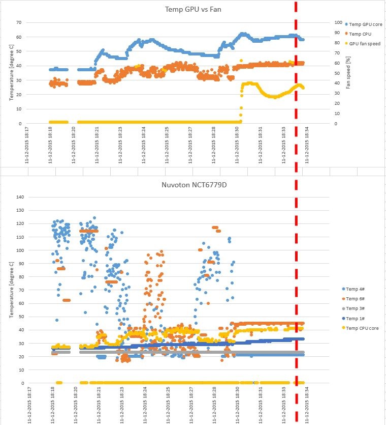 Ik heb crash gesimuleerd met een log op alle temperaturen en GPU fan: