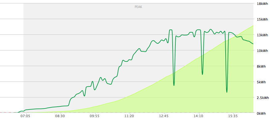 Het gaat best wel OK hier, maar niet zo goed als gisteren. Er is iets meer sluierbewolking. Maar we mogen niet klagen met ruim 3kWh/kWp halverwege de dag.