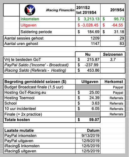 In 2019 hebben we bij $ 85,- (261 uur!) uitgegeven aan Hosting, ca. $ 100,- (ruim gerekend) aan hosting van Got-Racing.
