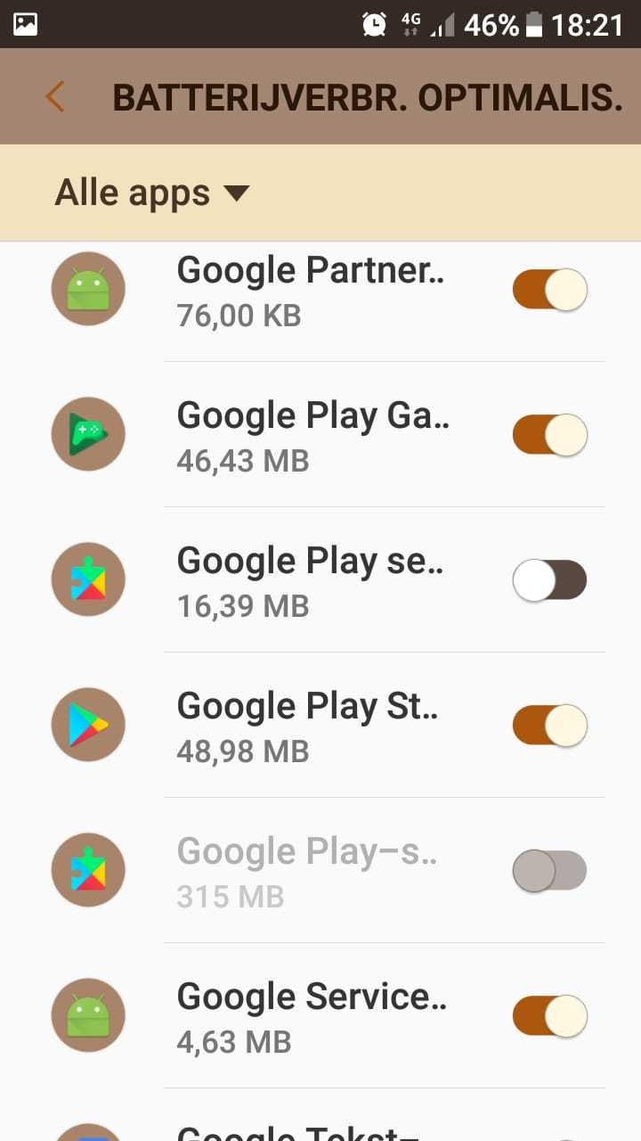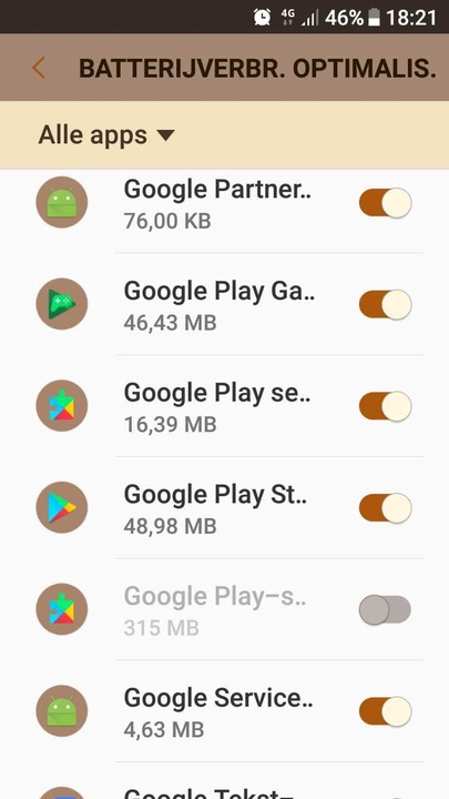 - Nieuw: Schakel hier ook 'Google Play services' uit van optimalisatie (schuifje naar links)