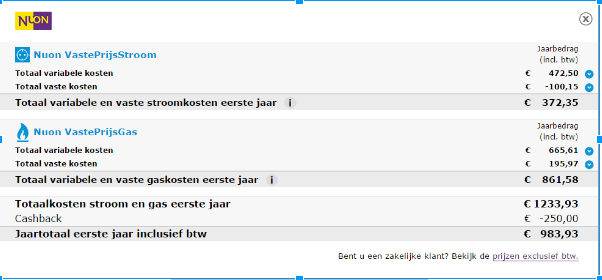 Ik zit op een verbruik van +/- 4750 kWh en 2.000m3. Via Pricewise schommelt de prijs zo rond de €2.250/€2.300 per jaar. Nu ploft er net een aanbod via mail in de box van Koopkracht.nl (voorheen groepsveiling.nl). Dit ziet er wel érg aantrekkelijk uit.