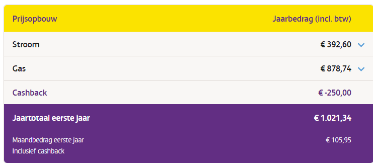 Bij het energiecollectief van Vereniging Eigen Huis krijg ik deze tarieven. Bij gaslicht kom je ook rond hetzelfde jaarbedrag uit, na aftrek van de cashback. Hetzelfde geld voor de Vattenfall Coolblue actie.