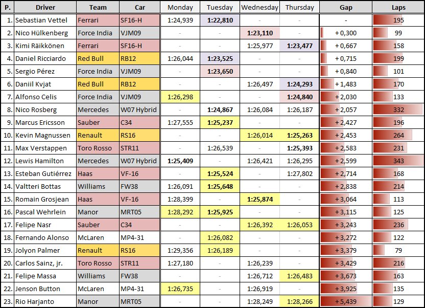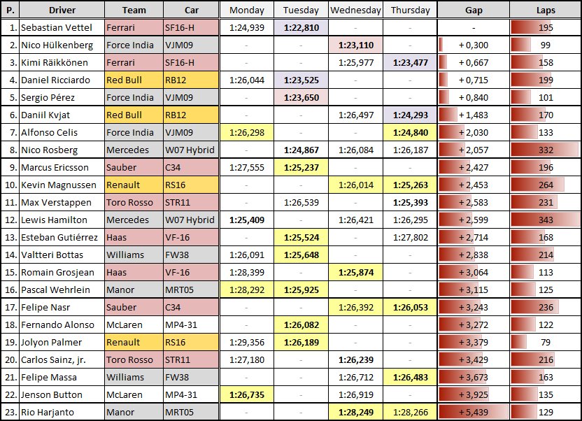 Uiteindelijk heeft Toro Rosso op Mercedes na het meeste laps gedaan deze week. Belooft veel goeds voor Verstappen, stuk minder ontploffende motoren hopelijk. En 1.25 op mediums is ook lang niet slecht, al weet je nooit hoe het zit met testen qua snelheid.
