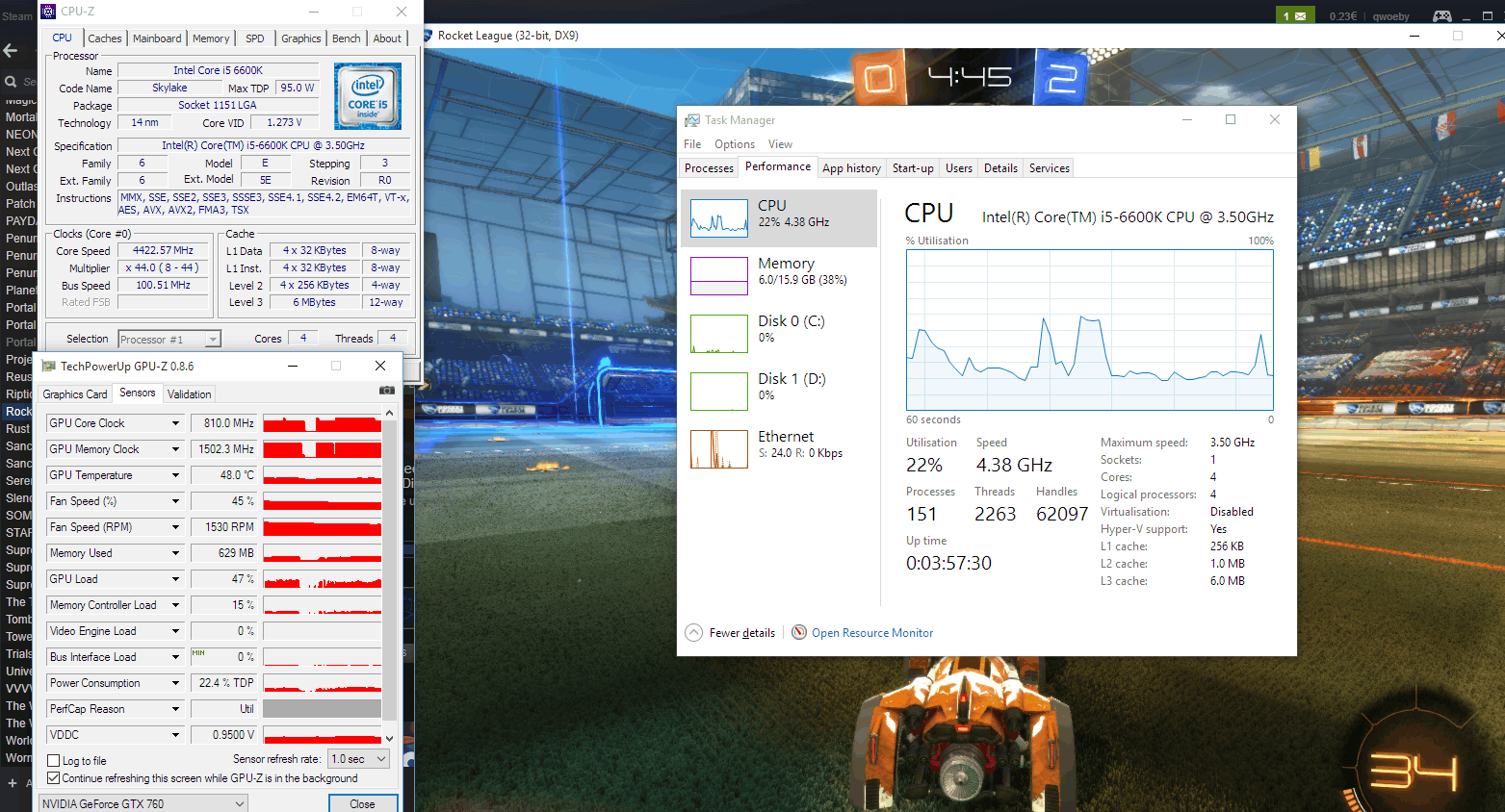 Sinds vandaag heb ik ineens last van tijdens het spelen van games van tearing/stuttering of iets in die trend. Bijvoorbeeld bij rocket league, draai ik soepel 60 fps op 1600*900 met een gtx 760. Echter naar een tijdje (zo'n 40 minuten) spelen stottert het spel heel erg (vergelijkbaar met 10 fps), maar blijft de fps counter op 60 staan. Daarnaast wordt het geluid constant 'distorted'. Het kraakt, verdwijnt soms en dat allemaal in gelijke frequentie met de beeldstotteringen. Ik heb een screenshot bijgevoegd van gpu-z, cpu-z