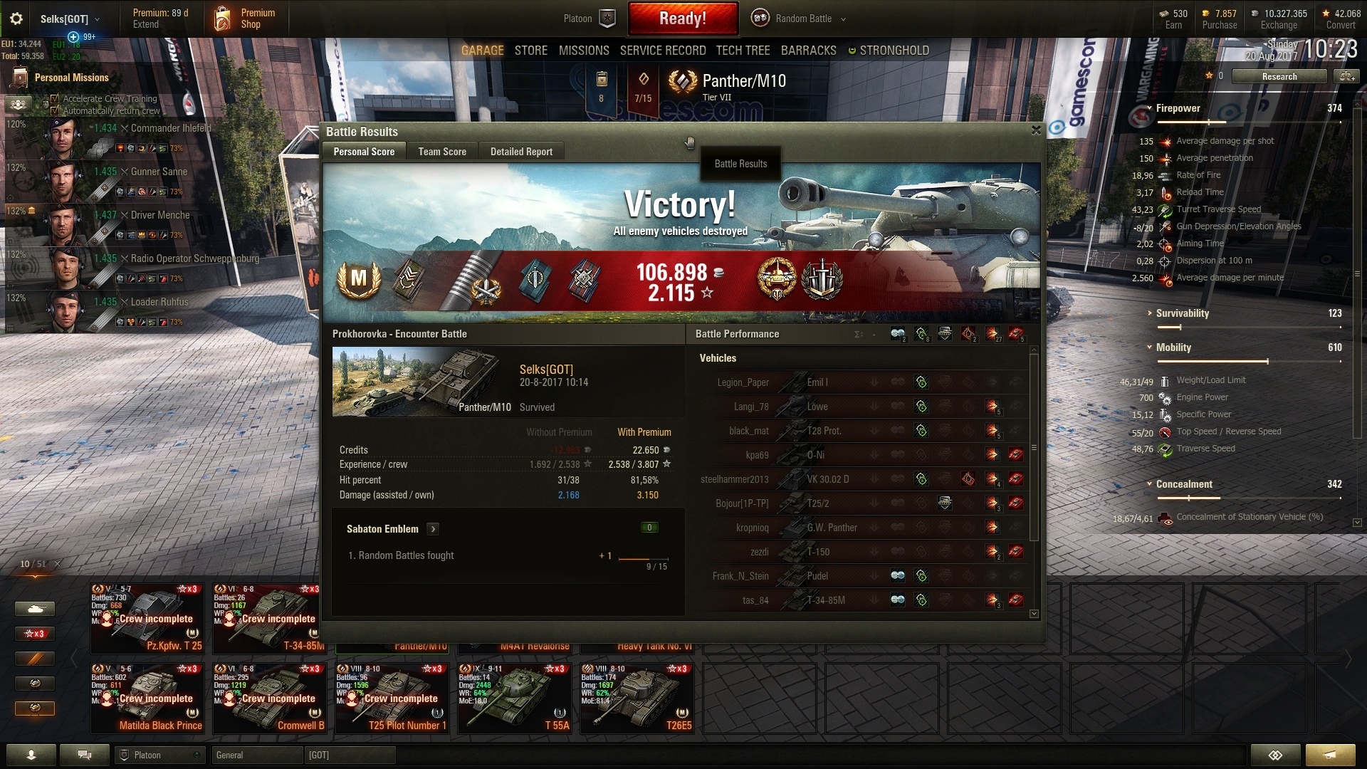 Gekocht dan dus: Cromwell B (VI erg fijne tank), PantherM10 (VII, ook erg fijne tank), M4A1 Rev (VIII, ook leuk, maar Premium tier VIII is gewoon lastig nu, geldt dus ook voor de laatste T26E5.