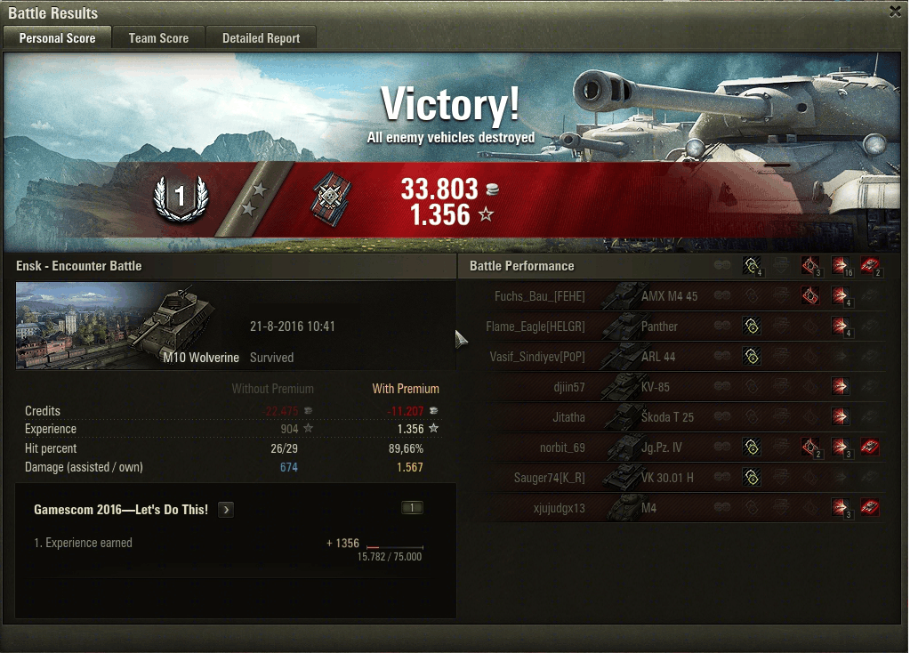 Wat de T20 al zei in de chat. Je was iets te afwachtend net als de rest van de tanks op jouw flank. Die cromwell was niet echt een bedreiging. Als je eerder had gefocust op de heavy tanks dan had je die flank waarschijnlijk ook eerder gewonnen. Nu stond je best een tijdje niets te doen.Alexander0506_1 schreef op zondag 21 augustus 2016 @ 19:57: