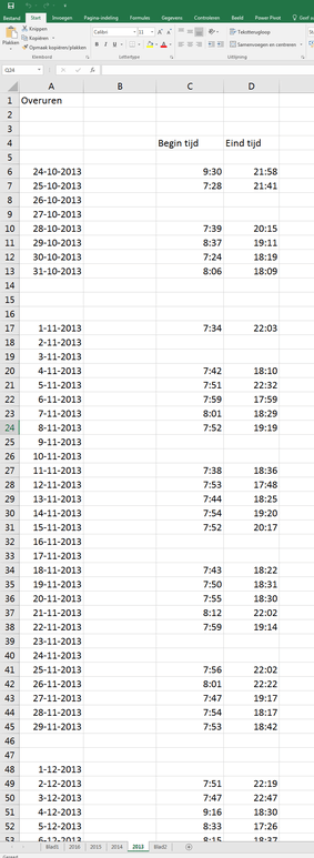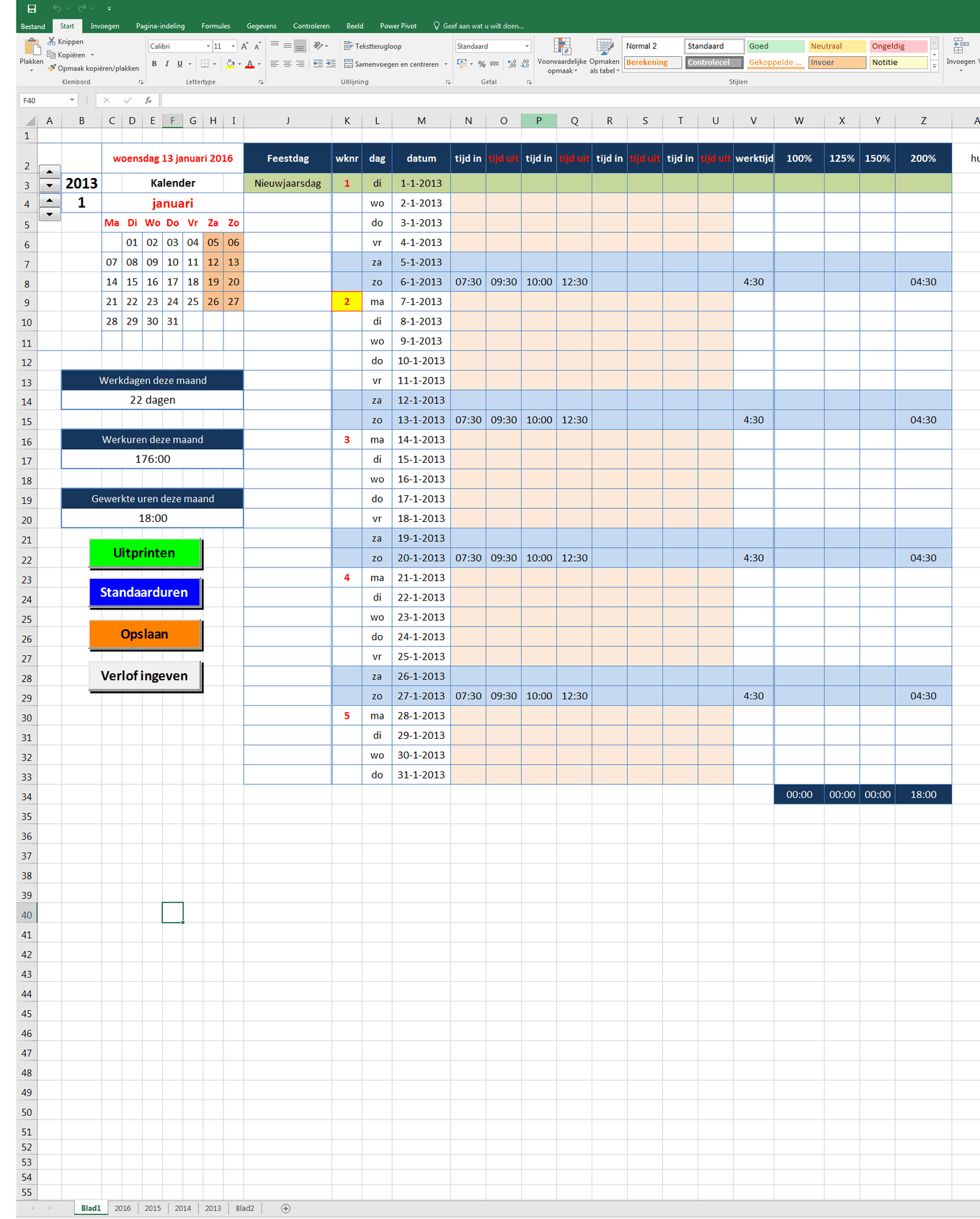 als ik bv de begin tijd op N4 en eind tijd op O4 invul, Dat die ze automatisch bijgeschreven worden in het 2de blad "2016', en als ik via de knopjes loop terug te klikken in der werkdagen dat het sheetje automish de gegevens er zet van de jaren, 2015, 2014, 2013 ect
