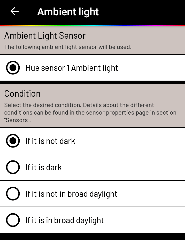Met een app zoals All4Hue kan je ook op licht waarde schakelen. Je kan twee licht niveaus instellen bij de Ambient sensor, één voor Dark (/Not dark) en één voor Daylight. Op deze twee waarden kan je regels instellen en lampen schakelen. Wel is het, zoals @Erik1971 aangaf dat de Ambient sensor maar 1x per 5 minuten zijn lichtsterkte doorgeeft.WishmasterNL schreef op dinsdag 6 maart 2018 @ 18:11: