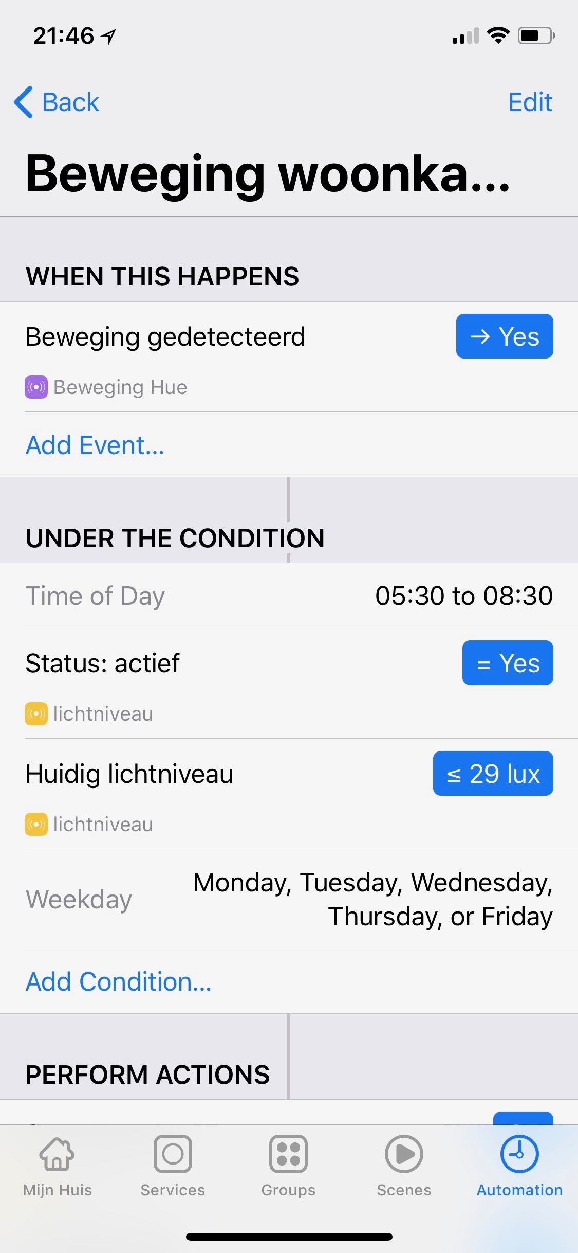Echter... de lampen gaan dus altijd uit, ook wanneer er beweging is (eerder over gehad, ik moet de oplossing van lux omhoog gooien nog even testen). En ook irritant: als ik de lichten aan doe via de dimmer of via de app, gaan de lampen alsnog uit omdat er geen beweging meer wordt geregistreerd. Zelfs wanneer ik de lampen aan zet zonder eerst langs de sensor te lopen... Ik heb via Hue Labs de formule 'do not disturb my scene' ingesteld, maar ook daarbij heb ik dezelfde problemen.