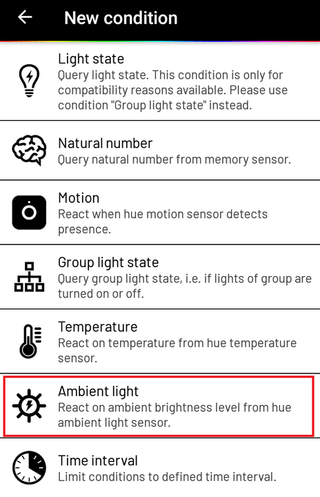 Bij mij staat in All4Hue onder optie Rules; nieuwe rule aanmaken en dan bij Conditions echt de optie "Ambient light"!