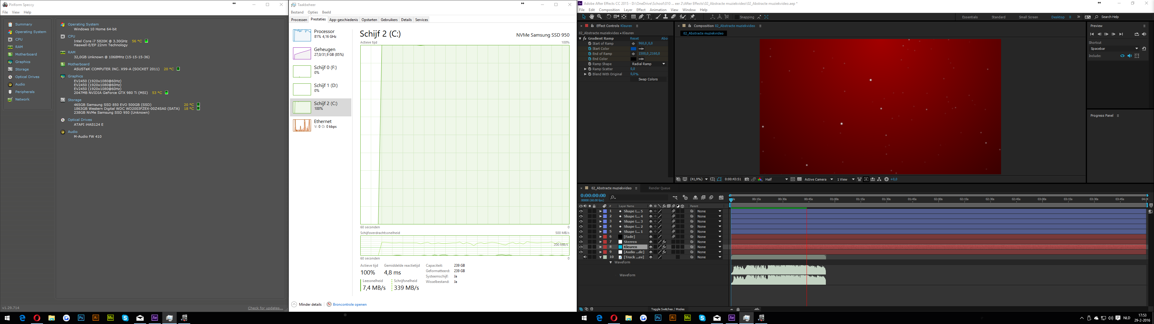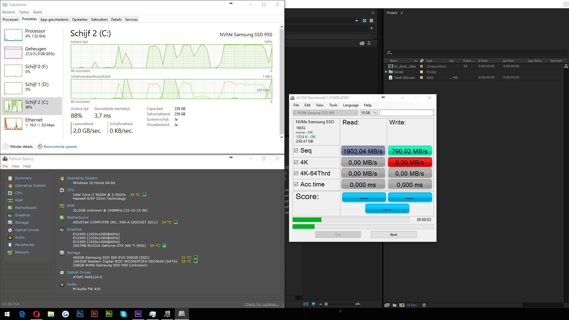 Hallo, ik heb een Samsung 950 Pro M.2 SSD maar deze wilt niet volledig werken in combinatie met Adobe After Effetcs. Wanneer ik een preview render maak springt de SSD wel naar 100% toe maar komt niet boven de 350mb/s uit. Zie link: https://i.gyazo.com/4986782f3e8c502280bdffaa6c445b9e.png