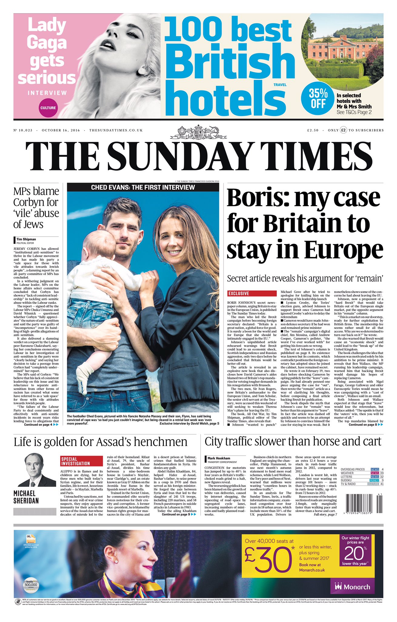 Cover foto van de Sunday Times.Boris's Remain article warns Brexit cd "encourage more shirtless swaggering from the Russian leader". Now dealing with that as foreign sec