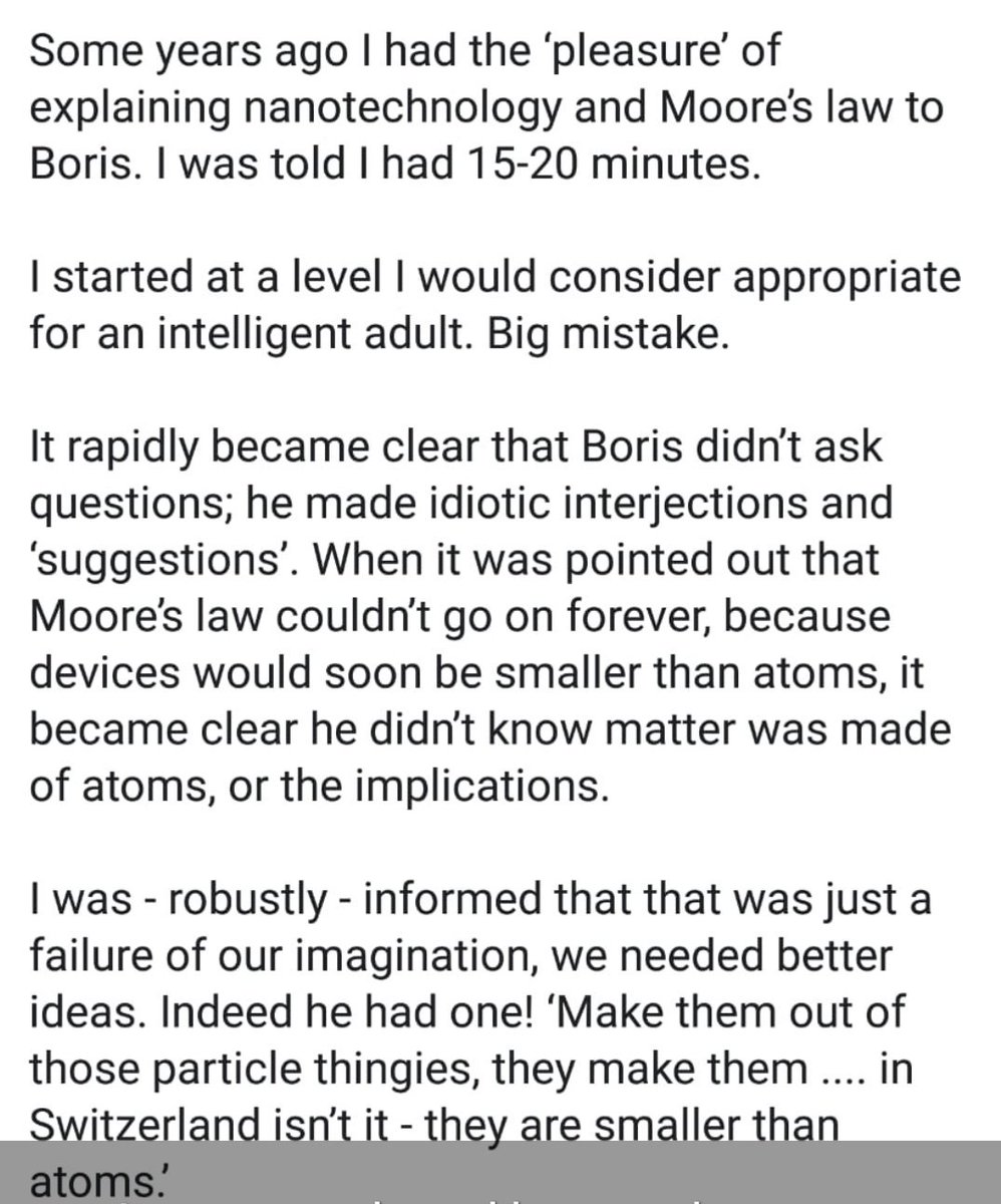 Er moet toch een moment zijn geweest in 2016 waarop personen in de Engelse regering bij elkaar zijn gekomen om duidelijkheid te krijgen wat nu precies die Brexit inhoud, in de verschillende scenareo's voor het land Engeland. En ok, dit weten ze niet precies dus laat men onderzoek uitvoeren; waar al snel naar boven komt dat transport, luchvaart, atoom energie, gallileo, CERN, Stroom voorziening, etc. allemaal afhankelijk zijn van EU regelgeving en allemaal in puin zullen liggen als er niet zo snel mogelijk nieuwe afspraken worden gemaakt.