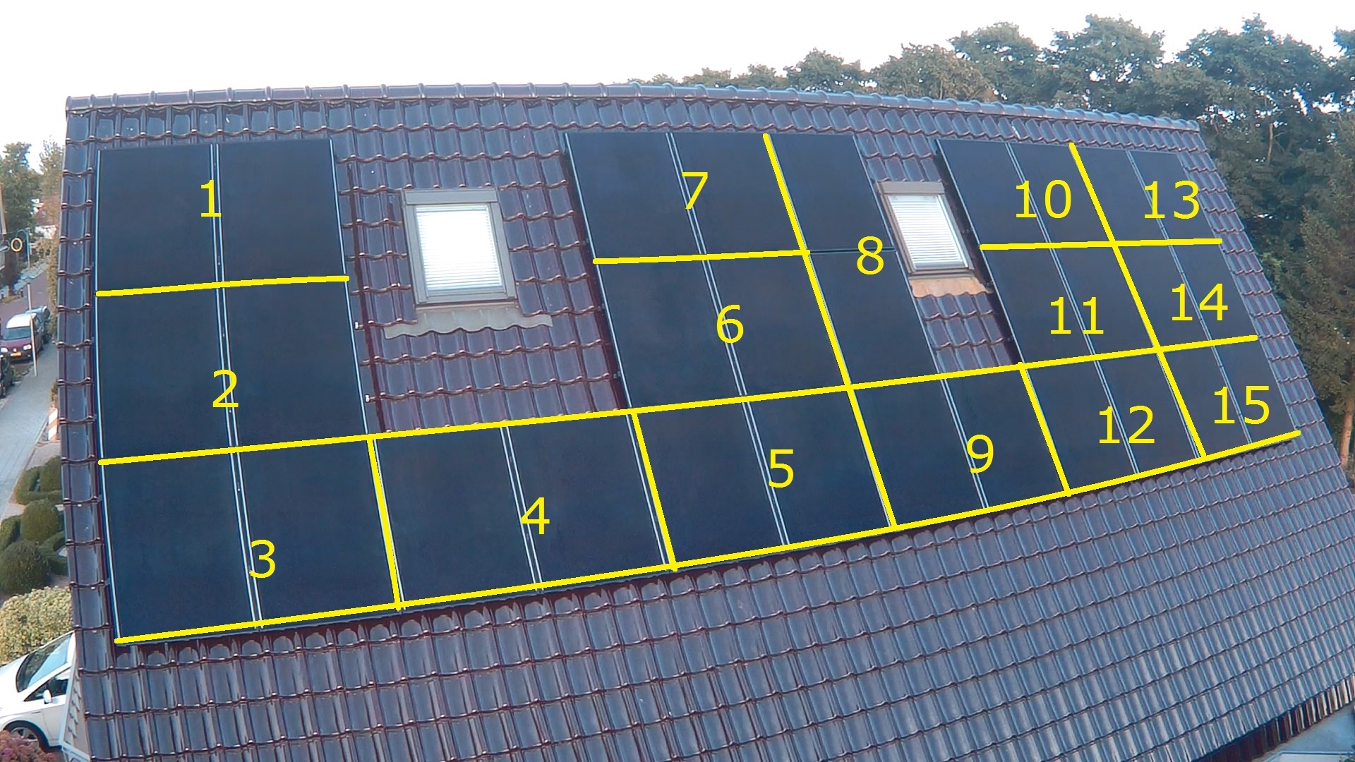 Ze liggen in een koppeltje van 2 en van 3 panelen met een mini dakkapel ertussen.