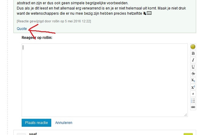 Zie veel mensen niet of slecht quoten, zou er niet gewoon een quote knop op de FP kunnen, je weet wel, zo eentje die letterlijk op elk forum te vinden is, en bij bijna elk reactie systeem dat dat knopen heeft, zelfs HWI heeft er een.