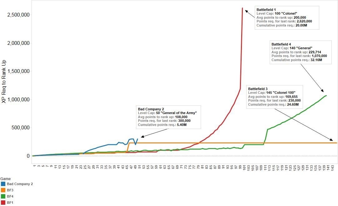 Kijkend naar deze grafiek lijkt het alsof je met BF1 heel lang bezig zult zijn om max level te halen, maar eigelijk valt dat nog wel mee.