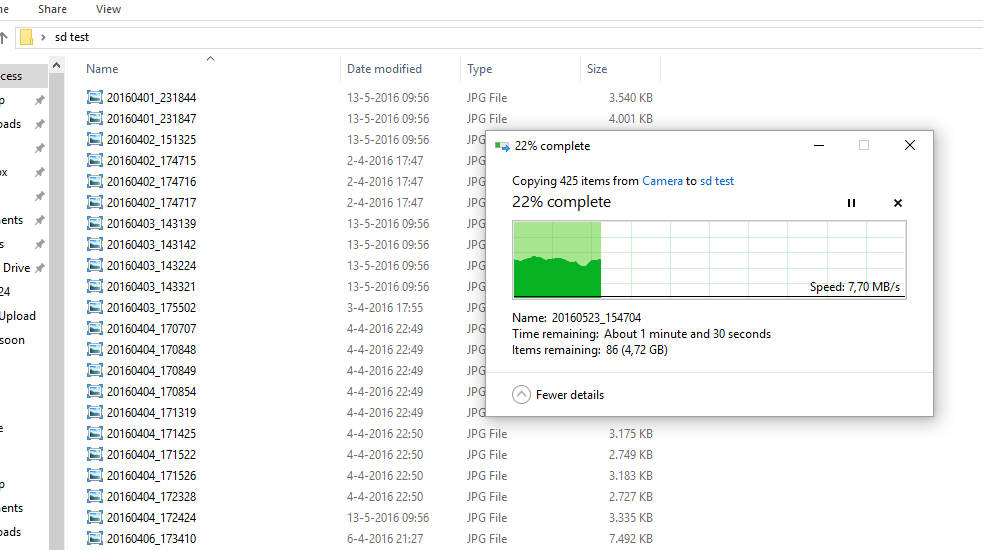 De kaart heb ik in mijn Samsung Galaxy S7 gestoken en in eerste instantie werkte de kaart prima. Na een maand, echter, begonnen er zich problemen voor te doen. De camera liep vast na het maken van een foto (filmen sowieso onmogelijk) en Spotify en Here Maps liepen vast op database errors. Uiteindelijk begon de telefoon zich op willekeurige momenten te rebooten, waarna voor mij de maat vol was. Vervolgens heb ik de kaart in de computer gestoken om alle foto's en video's eraf te halen, maar ook dat bleek onmogelijk. Vrijwel alle video's waren beschadigd en veel foto's openden niet.