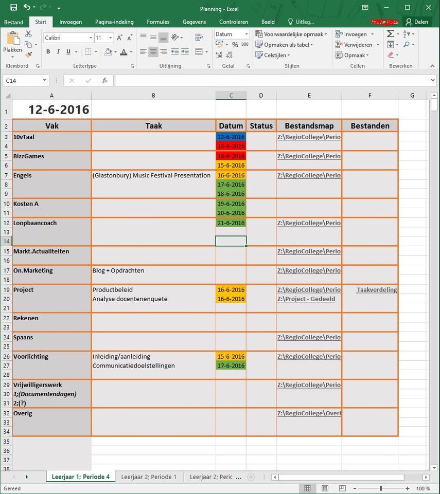 Ik ben momenteel bezig een "slim" Excel-bestand te maken om mijn planning enigszins op orde te houden. (zie foto)