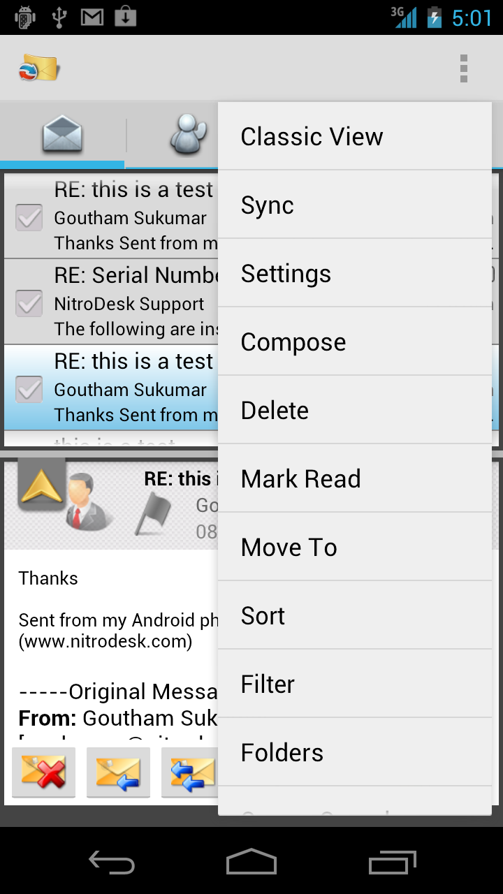 Tip installeer Touchdown HD in plaats van de normale Touchdown. De licentie voor Touchdown is ook geldig voor Touchdown HD. Recentelijk contact gehad met de support desk van Symantec en zij raden zelfs aan om Touchdown niet meer te gebruiken maar Touchdown HD te gebruiken. Overigens ziet Touchdown HD er een stuk mooier uit en je hebt inderdaad de drie puntjes rechts boven in de hoek staan waarmee je een menu krijgt waar de 'Sync' knop staat.rens-br schreef op woensdag 03 augustus 2016 @ 08:37: