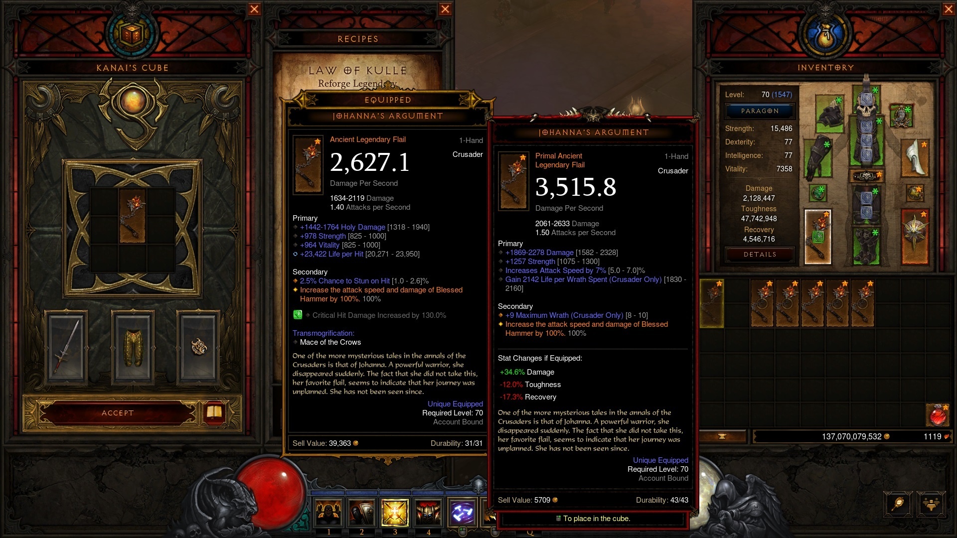 Eergisteren mijn seasonal Crusader omgevormd van Thorns naar een Hammer build. Dit beviel me toch niet helemaal, ondanks goede items (enkele ancients), vanwege lage survivability. Een aantal enchants gewijzigd, bvb life per hit op mijn wapen + alles door diamonds vervangen, maar heel comfortabel was het nog steeds niet, en ik geraak zeker niet op het niveau van mijn Thorns build.