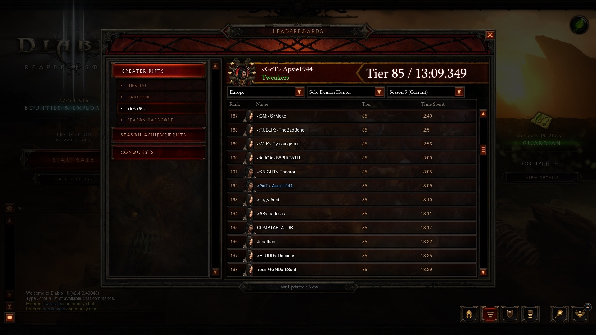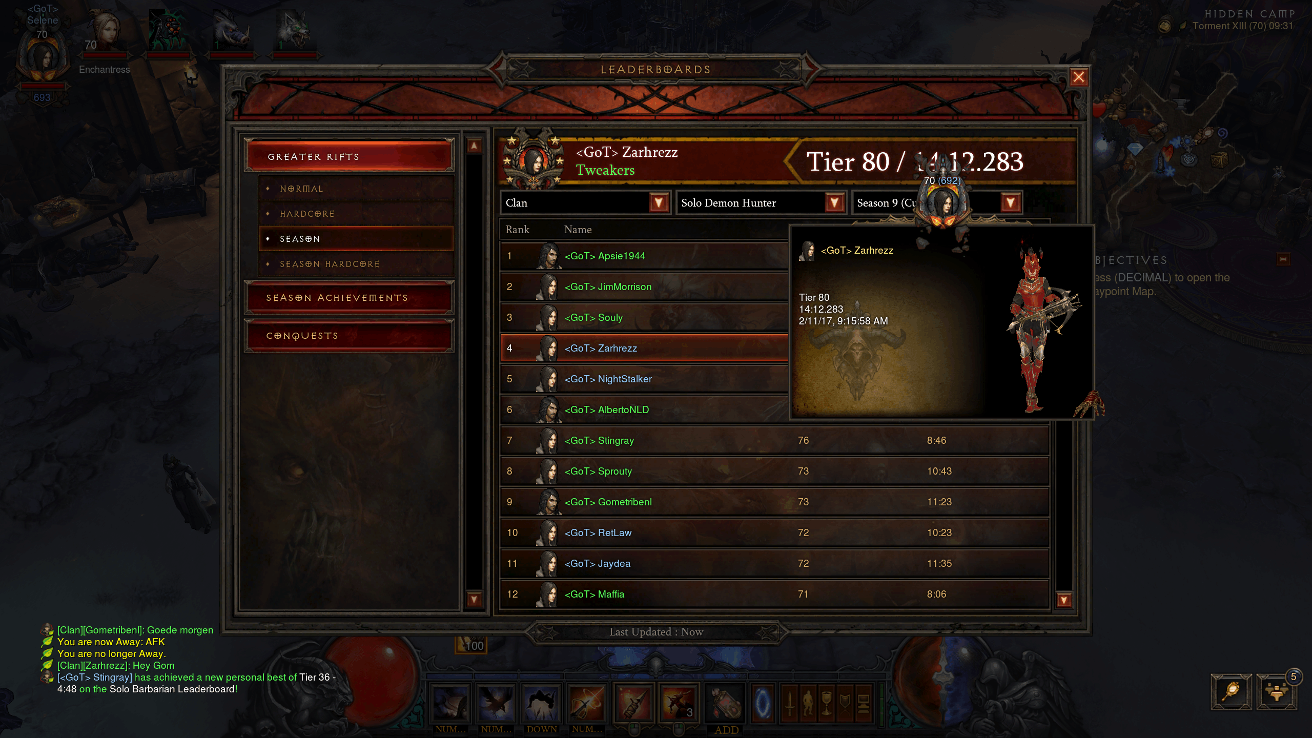Er staan ook veel guides van de top spelers en streamers die inderdaad op season de 95+ gehaald hebben...maar dan zie je dus ook vaak 90+ augments op alles en 1.5k+ paragon. Ook wordt er niet bij vermeld hoeveel rifts fishen het was voor die clear. Vaak loopt dat in de tientallen, soms in de honderden.