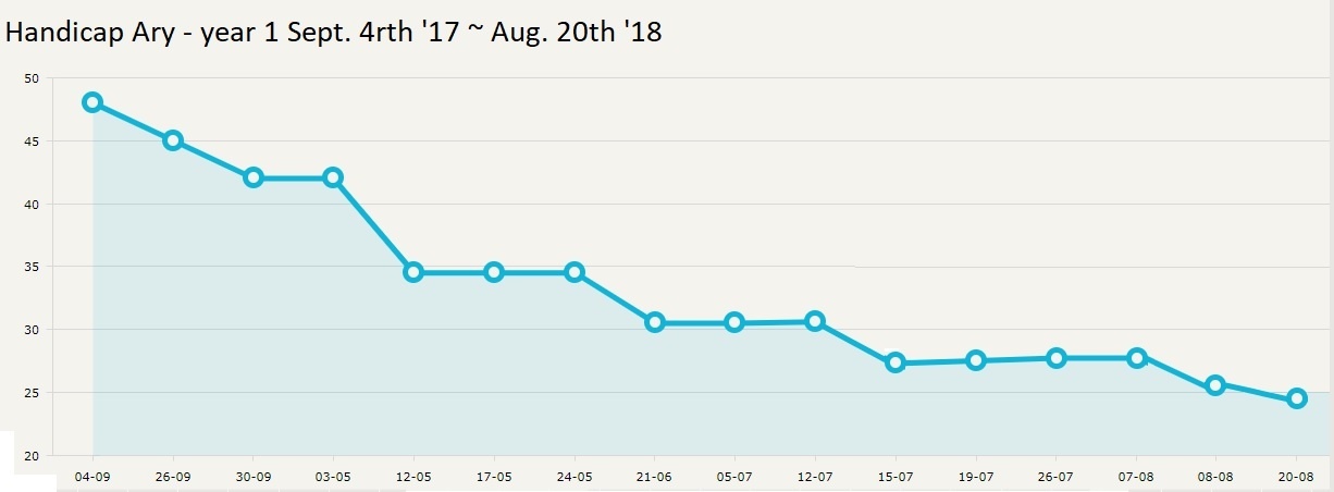 Ik speel nu een jaar of 2,5 en zit inmiddels op 29,6. Mijn doelen waren voorheen beter leren chippen en rechter slaan.