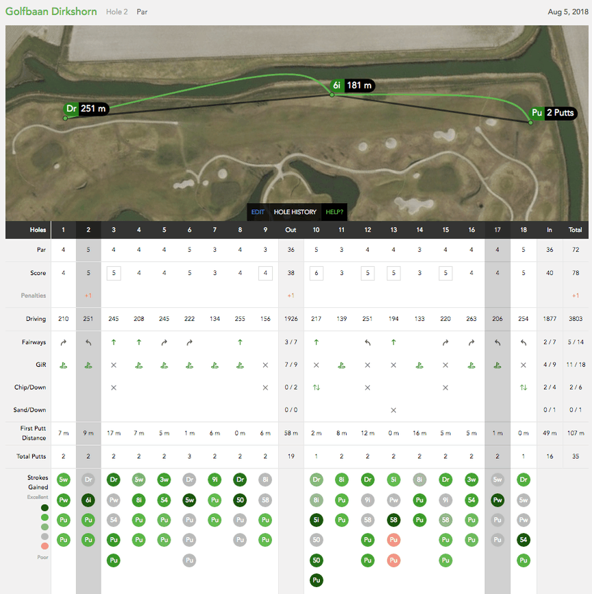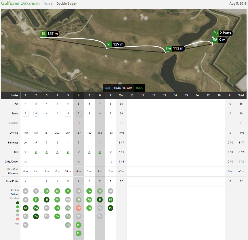 Op de 6e een wereldse birdie: dogleg rechts par 5, 3 hout van de tee, 7 ijzer naar binnen die ik wegduwde naar rechts een bunker in. Shit ligging, downhill vlakbij een lip, geen green om mee te werken, een bunker aan de andere kant van de green en een teebox (hole5) vlak daar weer achter. Natuurlijk een flight op die teebox en de Marshall stond ook te kijken, op de teebox rechts achter me (7) stond een flight en ook op de teebox links achter (8 ) een flight.