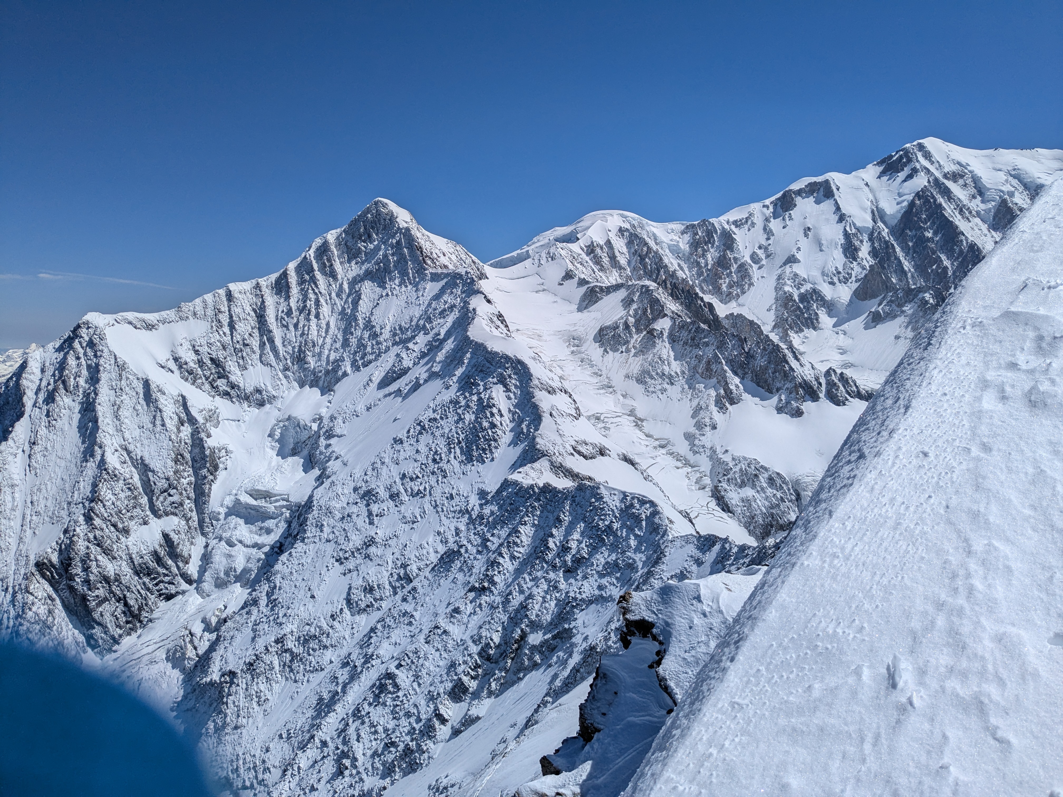 Vanaf Domes des Miage richting refuge Durier (als je goed zoekt kan je 'm vinden op de foto) en de graat naar Aiguille de Bionnassay midden-links en dan Mont Blanc rechts. Je ziet hier bijna de hele route van de volgende dag (behalve de afdaling over Trois Monts naar Aguille du Midi):