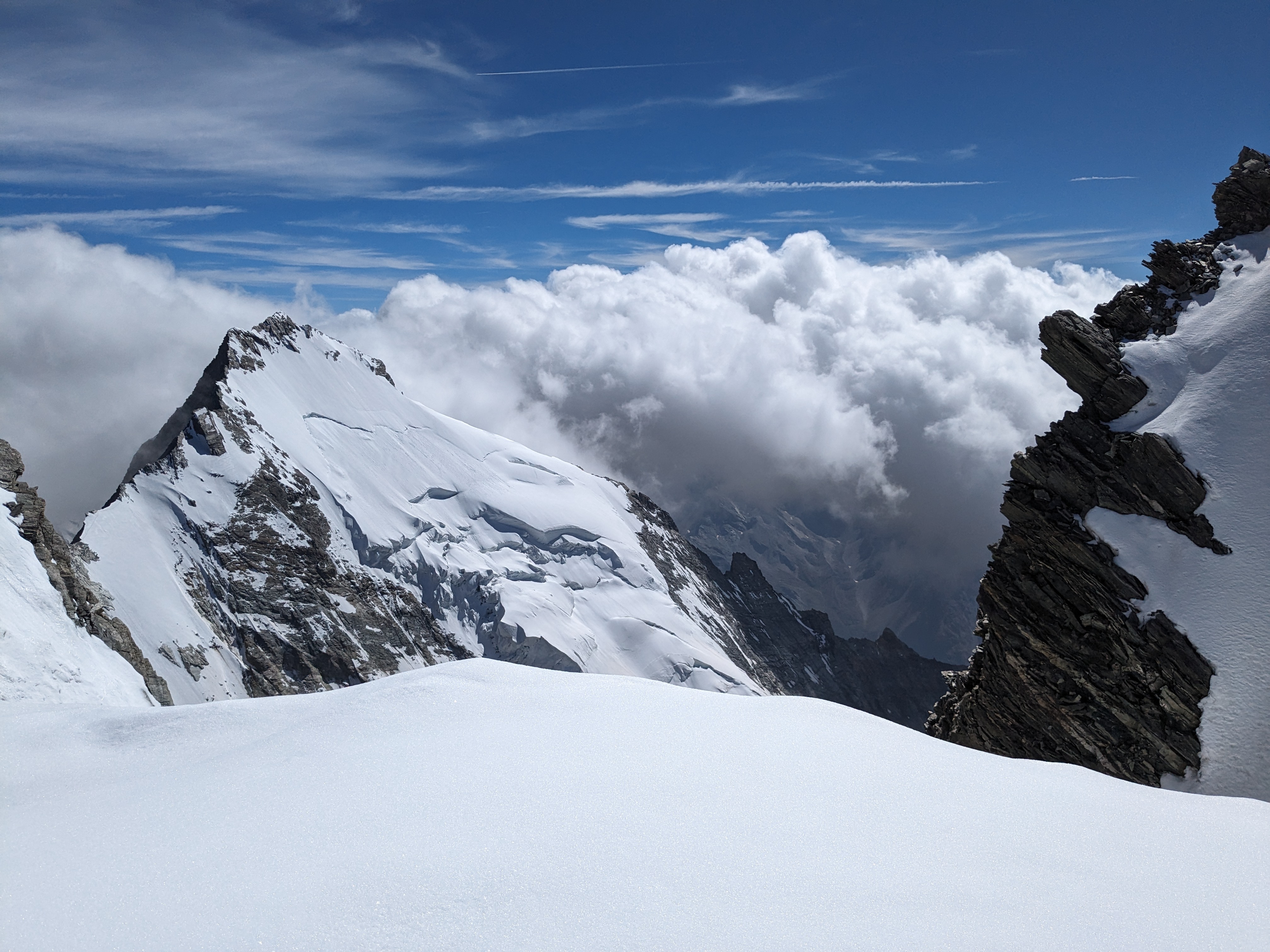 We wilden ook nog de traverse Zumstein > Dufourspitze > Nordend doen, maar helaas waaide het gigantisch hard en besloten we bovenop de Zumstein om verstandig te zijn en om te draaien.