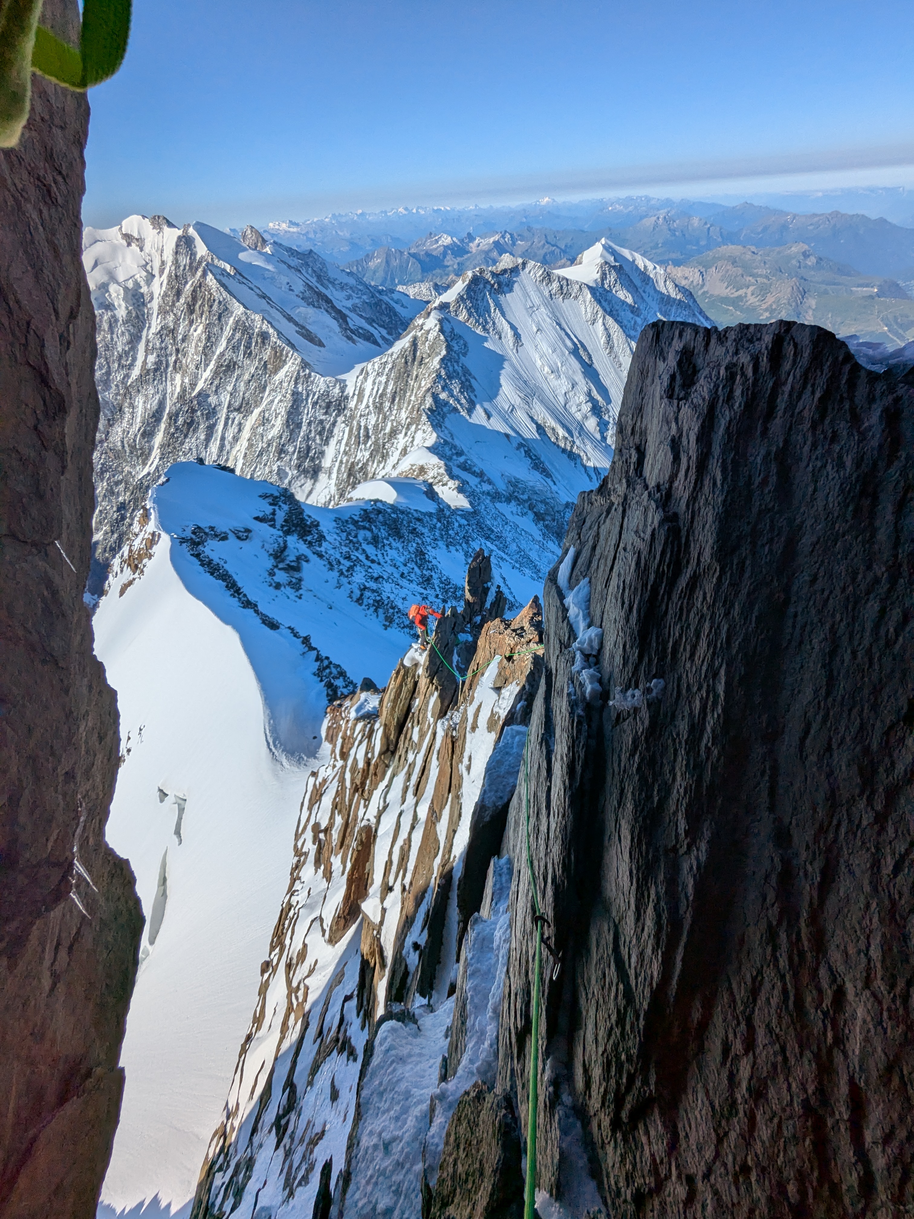 Hoe dan ook, zo lang het nog kan dus nog maar goed genieten van fantastische Alpen. Er is nog genoeg moois. Het wordt alleen wel steeds lastiger qua weer-windows om te klimmen, vooral naar hoogte en icm gletchjers die na 13:00 uur vaak verradelijk gevaarlijk worden (crevasses, zwakke onzichtbare sneeuwbruggen, ijsval van boven, steenslag van boven door smeltend ijs waar stenen in vast zaten). Maar die puzzel hoort ook bij het avontuur