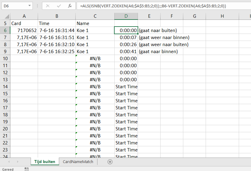 Nu is het probleem dat tijd in de vierde kolom verkeerd wordt berekend. De tijd dat koe 1 buiten is geweest is maar 7+15=22 seconde, en geen 41 seconde. De formule die in D6 staat is: