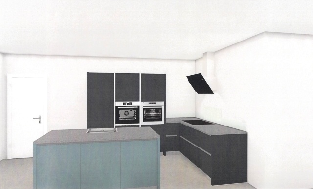 * Het kookeiland van 240cm lang, de breedte zal nog afhangen van het type onderkast. In of boven het kookeiland een recirculatie afzuigkap. Onder het kookeiland 3 kasten en een kort vrijhangend deel als kleine bar/ontbijtmogelijkheid.