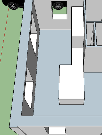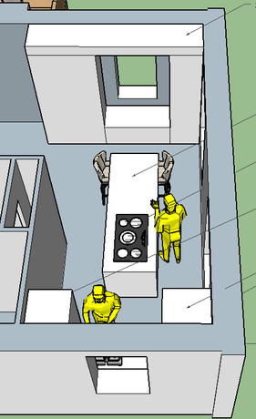 Middels Sketchup heb ik het huis in een 3D model beschikbaar en ook diverse keukenontwerpen al gemaakt. We willen heel graag een kookeiland, maar de beschikbare ruimte is relatief smal (2,5 meter). Alternatieven als hoek / u / schierkookeiland vinden we allemaal minder mooi. Nadeel is wel dat het eiland wat smal wordt, maar daar zijn we ons van bewust. Afhankelijk van het type onderkasten kan deze 65cm tot max 90cm breed worden.