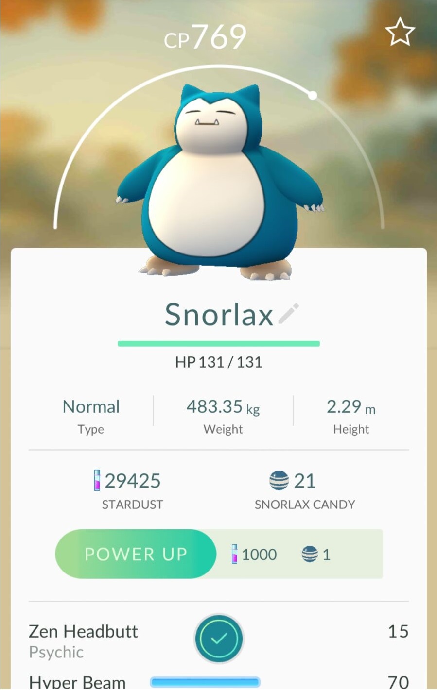 Mijn ei Snorlax met CP508, HP 107 heeft een gemiddelde IV van 93,3%. Denk dat dat best netjes is en een reden om die te poweren?