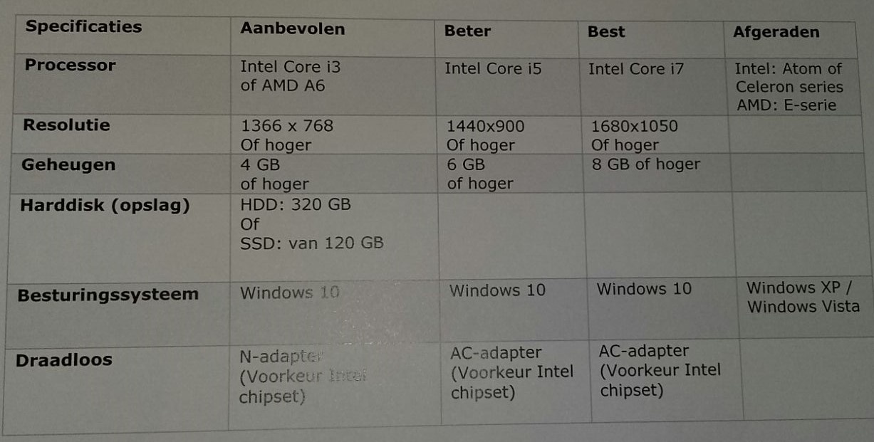 Nadeel ten opzichte van hun voorstel is echter minder geheugen, minder opslagcapaciteit en 100mpbs vs 1000mbps ethernet-card. 4GB geheugen lijkt mij echter voor de taken in eerste instantie voldoende en bovendien makkelijk te upgraden. De opslagcapaciteit is met 500GB wel een stuk minder, maar lijkt me voor schoolgebruik voldoende. De ethernetcard is jammer, maar mijn inschatting is dat zij niet veelvuldig bestanden over het netwerk zullen verplaatsen en vooral de wifi zullen gebruiken om te internetten.