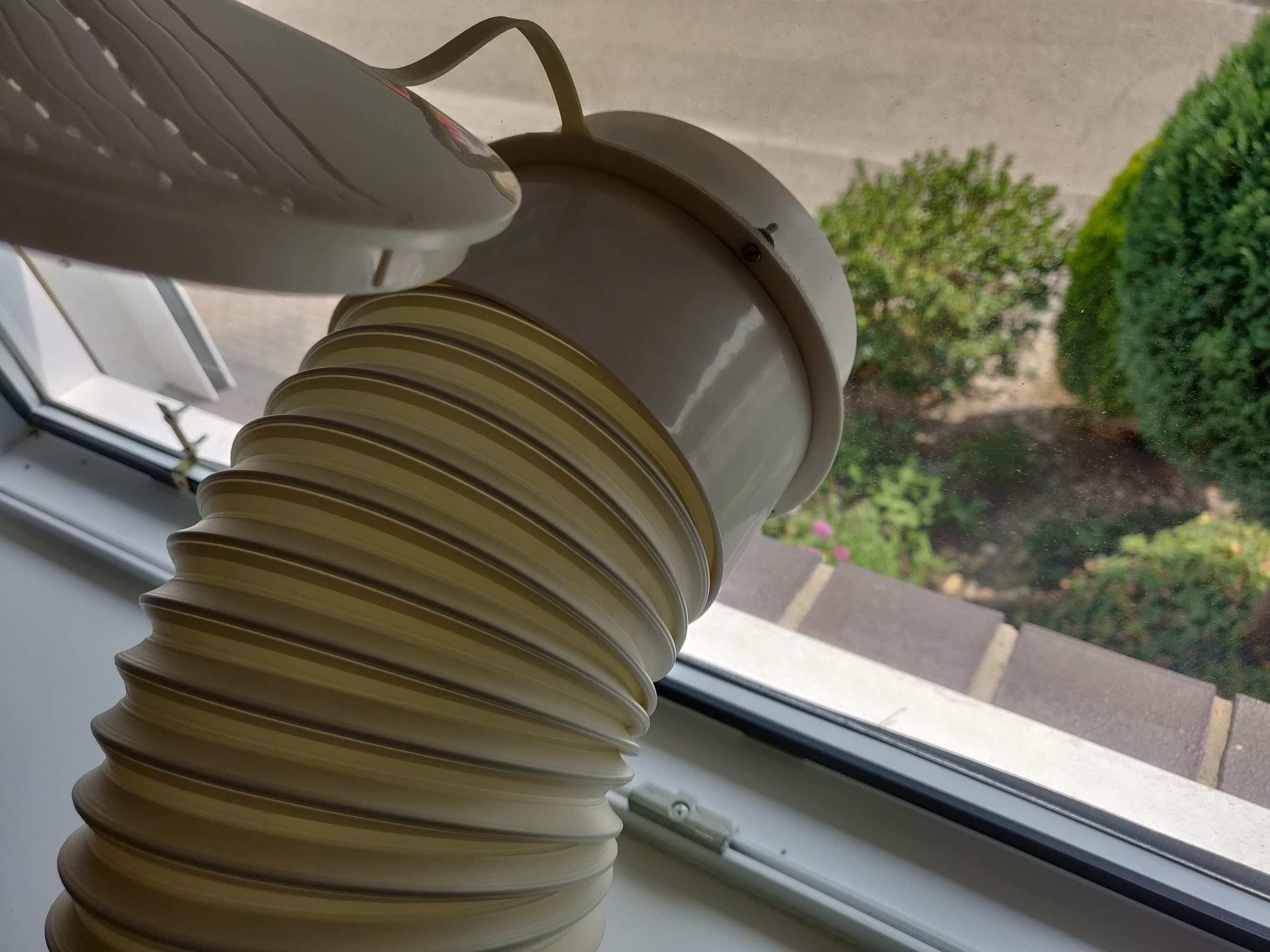 Mijn vader is op het idee gekomen om dan de balkondeur open te zetten en er een zeil voor te doen om op die manier toch de buitenlucht buiten te houden. Twee gaten erin voor de aan- en afvoer, goed uitlijnen en draaien maar!