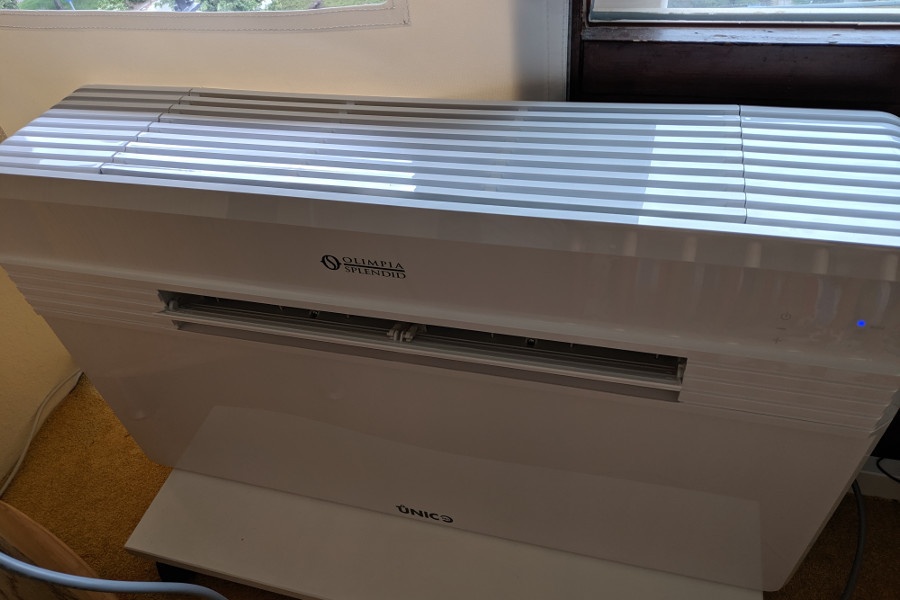 Het is de Unico Pro Inverter 12 HP A+ geworden, wat ik al in een eerdere post had gemeld. Wat een groot ding is het! Ook al kan je de afmetingen op de productpagina wel zien, het is heel wat anders om dat ding in het echt te zien. Helaas ben ik er wel snel achter gekomen dat het toch niet op de plek van het klapraampje gaat passen. Wat ik niet had kunnen lezen (handleiding stond op dat moment nog niet online), was dat er aan de bovenkant een klep zit met daarachter het luchtfilter. Met de beperkte ruimte die ik daar zou hebben, zou dat dus nooit gaan lukken om elke 2 weken (volgens de handleiding) te reinigen. Eruit halen zou misschien nog wel lukken, maar op de tast het filter terugzetten zag ik totaal niet zitten. En bij nader inzien heb ik ook wat twijfels aan de draagkracht van de plek waar ik de airco wilde gaan ophangen, dus moest er een andere oplossing gevonden worden.