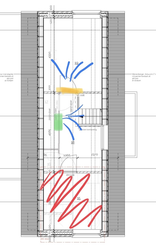 Als ik het zo lees, dan zal de bovenverdieping met 1 Split Unit wel werken. De airflow; ik ga hem plaatsen in de slaapkamer recht tegen over de slaapkamer deur. Als die dan gaat blazen dan gaat het richting de deur tegen een muurtje aan, als de lucht hier tegen aankomt, dan zal de lucht zich verplaatsen naar de andere slaapkamer deur. Verder kan het daarna nog een klein stukje de gang op en achterin de gang heb je een open trap met beneden aan de trap een deur. Deur dicht laten zeker zodat de kou er blijft hangen?