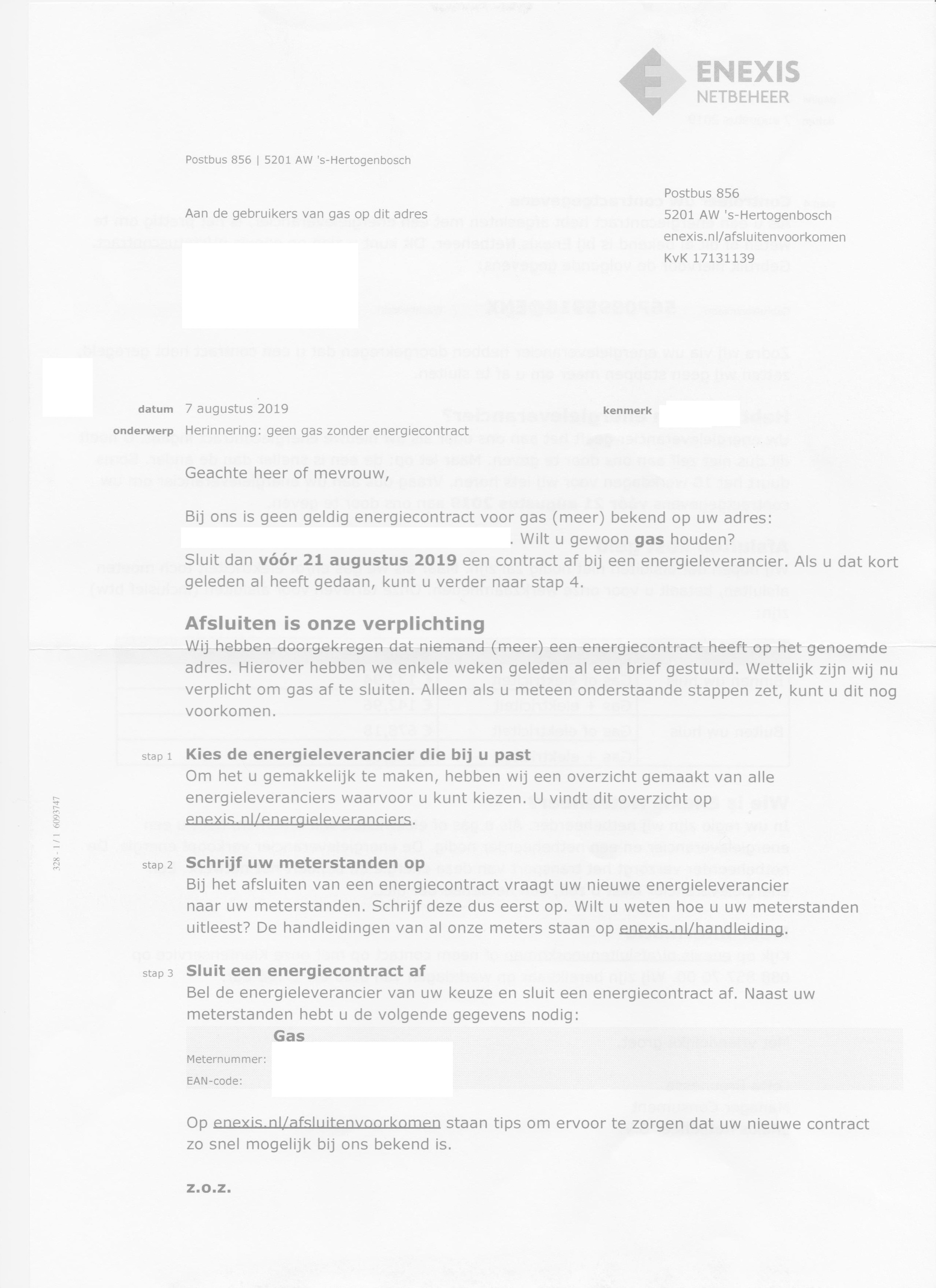 Liander is de netbeheerder in uw regio. Wij zorgen ervoor dat u nu al gebruik kunt maken van gas. Op bovenstaand adres is geen energieleveranier bekend. Kiest u wel snel een energieleverancier? Anders moeten wij u afsluiten van gas. Dat doen we niet graag, want dan kunt u geen gas meer gebruiken. Een afsluiting is een tijdelijke oplossing. in deze brief leest u hoe u zich aanmeld bij een energieleveranvier.