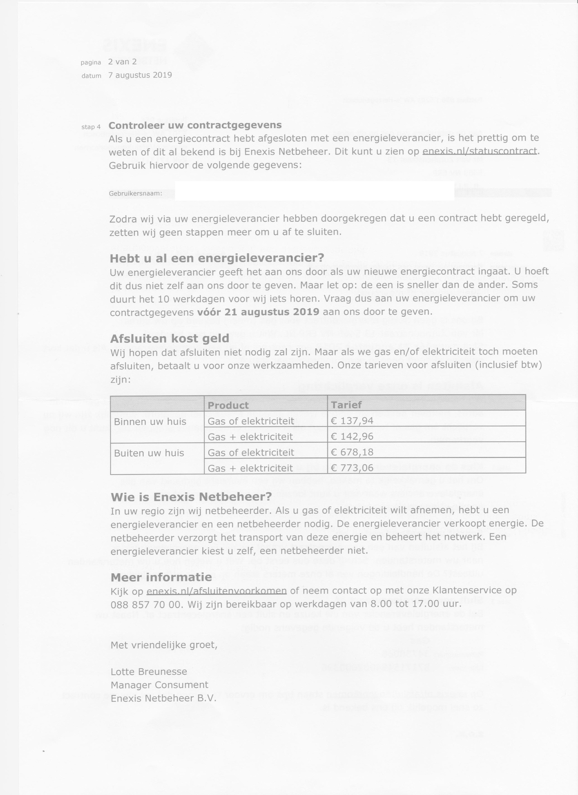 2. Ik heb u al eerder te kennen gegeven dat, als u de gasaansluiting buiten gebruik wil stellen, ik u daartoe in de gelegenheid zal stellen (zie o.a. mijn brieven van 23-11-2018 en 7-1-2019). Ik herhaal echter dat ik in geen geval hiertoe opdracht zal geven noch dat ik de eventueel hieruit voortvloeiende kosten voor mijn rekening zal nemen.