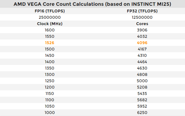 MI25 is een volledige Vega GPU met een onbekend aantal stream processors op een onbekende frequentie, alleen de FP16 performance zijn 25Tflops en daar zou je bijvoorbeeld op kunnen komen met 4608 stream processors op 1356MHz of 4096 stream processors op 1526 MHz.