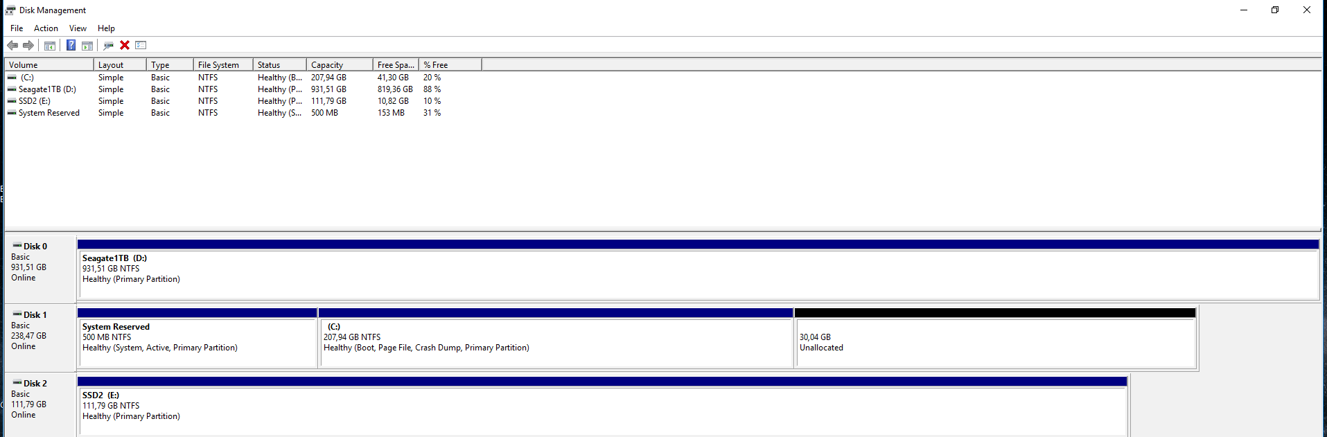 De situatie is als volgt ik heb WIN10 en zou graag daar UBUNTU in dual boot bij krijgen. Dus heb ik even gezocht en deze handleiding gevolgd. Aangezien mijn bios in legacy staat leek dit mij wel geschikt. SSD met WIN10 op een 30GB daarvan geshrinkt en is dit de situatie voor installatie.