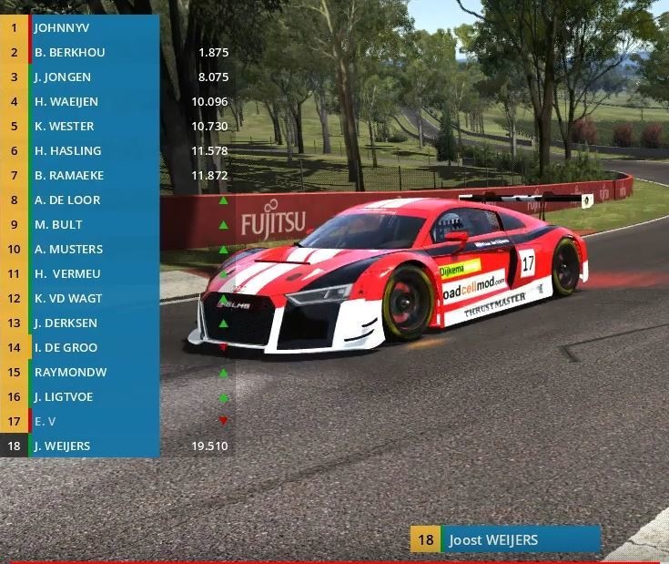 Helaas maakte ik een fout, mogelijk met een achterblijver, maar ik had iig rode bandjes, kreeg hem onderaan de berg niet op tijd aangeremd en toen brak de kont weg en zal ik jou geraakt hebben waarna ik rond ging terug de heuvel op. Snel weer rechtgezet, maar met 4 rode bandjes en 3 plekken ingeleverd Conrod Straight af .... verderop nog wat schermutselingen en 1 keer bovenaan rechts de kont verloren op de kerb en linksaf de muur in en met een pirouette onder het bord door .. daarna was het definief gedaan met de rondetijden.Maar daarna begon ik wat in te lopen en had ik mazzel dat hij in de clinch lag met een achterblijver ?