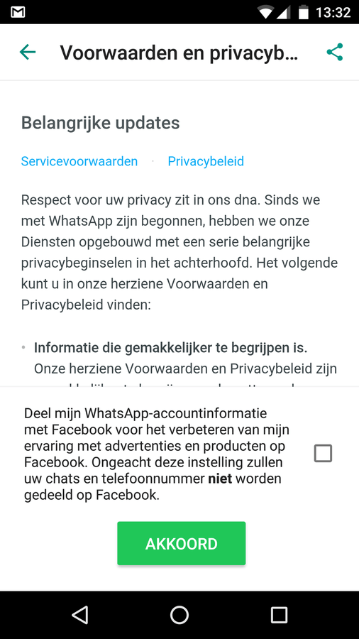 Ik kreeg deze melding en heb de voorwaarden niet geaccepteerd. Wordt er nu wel of niet iets gedeeld?Wanneer je onze bijgewerkte Servicevoorwaarden hebt geaccepteerd, zullen wij bijvoorbeeld bepaalde accountinformatie met Facebook en de Facebook-bedrijvengroep delen, zoals het telefoonnummer dat je hebt geverifieerd om je te registreren bij WhatsApp, zowel als de laatste keer dat je gebruik hebt gemaakt van onze dienst.
