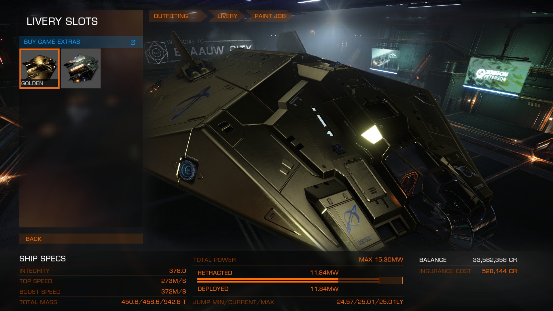 Als je een golden paint job bezit (voor welk schip dan ook) dan heb je er nu een extra paint job bij: een opgeleukte gold paint voor datzelfde schip. Oude skin heb je ook nog, mocht je die mooier vinden.