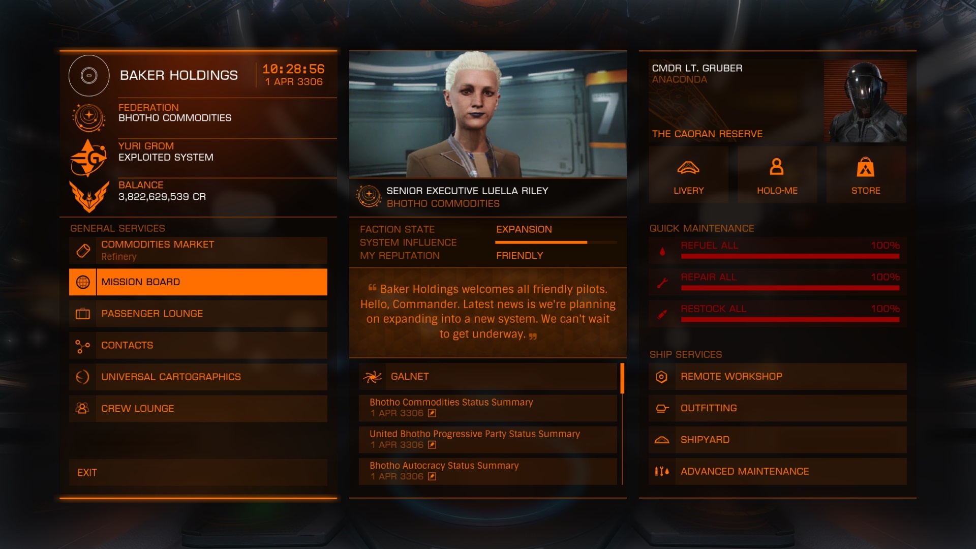 Nou het mocht allemaal niet opschieten met minen gisteravond (diminishing returns + een beetje pech), want kon geen LTD's vinden als mijn leven er vanaf hing, 7 LTD's in meer dan een anderhalf uur, dus toen was ik het zat, en ben ik maar transport missies gaan doen, snel even Python omgekat naar full cargo carrier, en rondje Jacques > Ogmar > Deriso voor +/- 3 á 4 miljoen per station, of 25-30 milj. p/uur, dus mijn Krait MKII staat weer voor de deur....