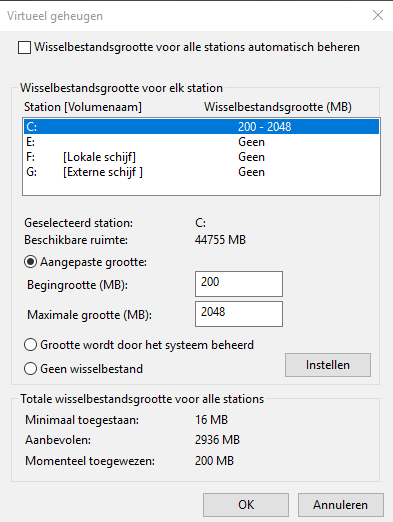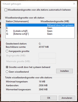 Waar ik ook achterkwam is dat de artikelen op het internet tegenstrijdig zijn, want de ene zegt dat je met 16GB RAM geen pagefile nodig hebt, de ander zegt dat je het wel degelijk nodig hebt maar genoegen kunt nemen met weinig (1GB) en er zijn ook mensen die zeggen dat er een regel is die zegt dat je pagefile altijd 1,5X het aantal RAM moet zijn. Dan is er ook nog een groepje dat zegt dat je het beter door Windows zelf kunt laten regelen.